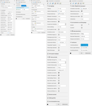 Sonstige wichtige einstellungen: Der Werkzeugpfad ist ganzschön hacky ... keine ahnung wie man das richtig macht. Ich hab eine Kontur zum "bohren" missbraucht. indem ich eine spiralförmige Materialeinfahrt mit 10% steigung gewählt habe. Danach wird das Loch auf seinene eigentlichen durchmesser gebracht durch Schlichtvorgänge mit einer Querzustellung von nur 0,01mm.